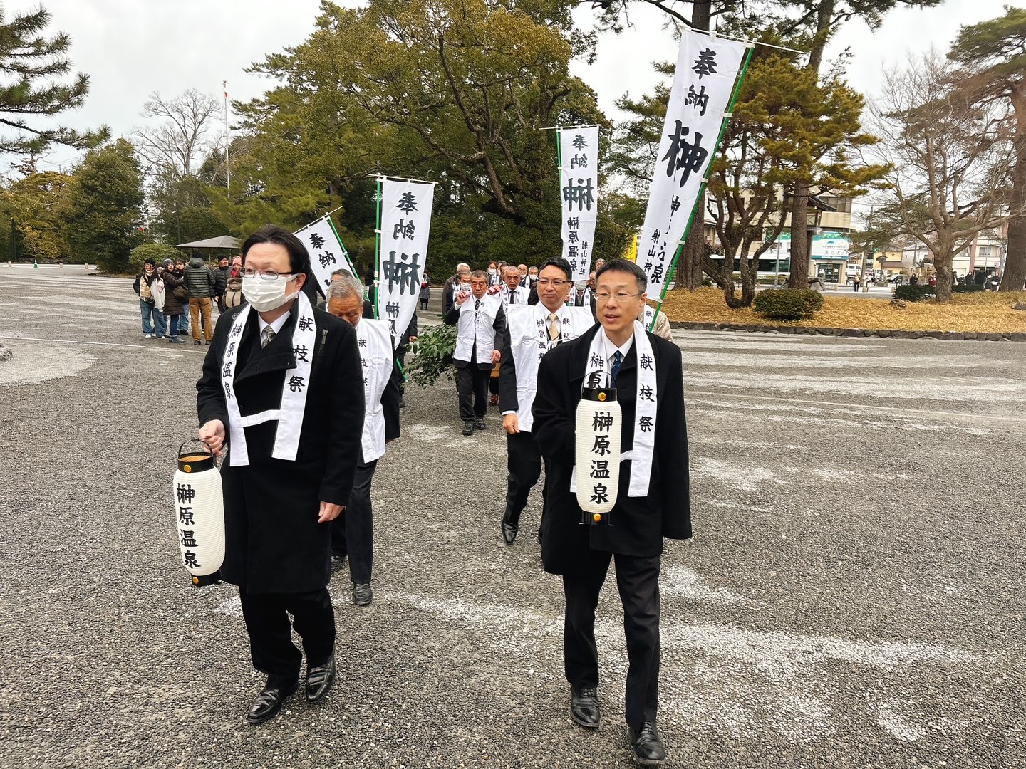 令和8年2月13日(金)第17回献枝祭が執り行われます。射山神社でお祓いを済ませた榊を貸切バスで伊勢神宮外宮に向かい榊を奉納します。当日は、射山神社の一日氏子としてご参加いただくことが出来ます。ぜひ、この機会に榊原と伊勢神宮とのつながりを知っていただくとともに、伊勢神宮で特別な時間を過ごしてみませんか。