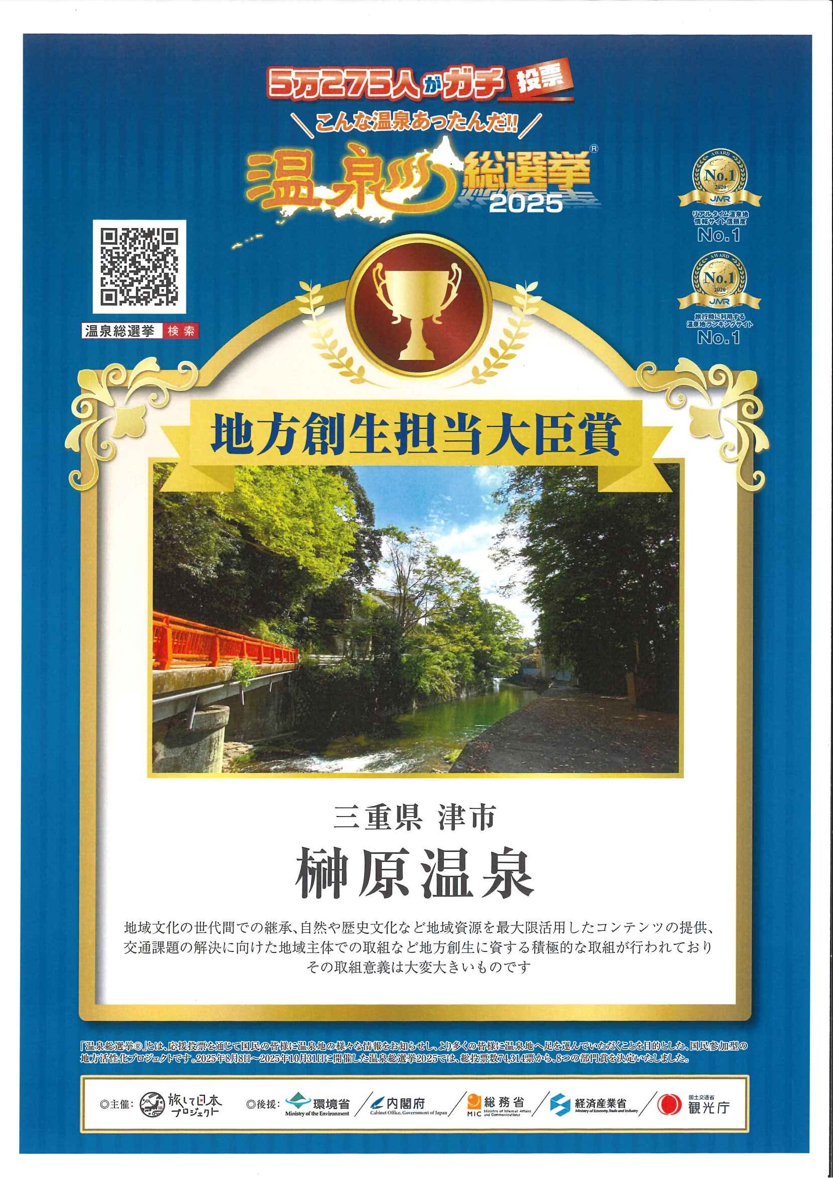 お知らせ詳細 お知らせ 2025年12月24日 地域創生担当大臣賞受賞しました 去る12月4日、東京において温泉総選挙2025の表彰式が行われ、榊原の地域振興を考える会など地域が主となった榊原地域や榊原温泉の活性化に対する取組が評価され、地方創生担当大臣賞を受賞することが出来ました。これもひとえに榊原温泉を愛してくださる皆様のお陰と厚くお礼申し上げます。